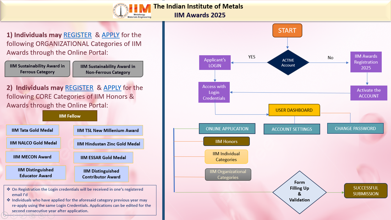 The Indian Institute of Metals has developed an Online application & assessment portal, effective from 2018 March, in line with Indian National Academy of Engineering, New Delhi[INAE]. The Online portal constitutes provisions for application for Core Categories of Award, both for NMD & IIM. [Applications-Assessment end to end process has been designed 100% ONLINE for NMD Awards wef 2018; 100% online for IIM Awards wef 2020]